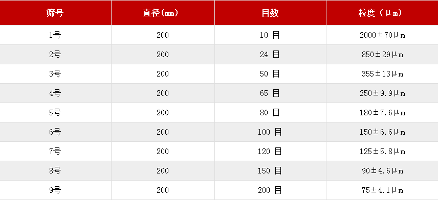 按照《中國藥典》規(guī)定,標(biāo)準(zhǔn)藥典篩網(wǎng)孔需符合GB/T6003-2012(即國際標(biāo)準(zhǔn)ISO3310),其網(wǎng)孔基本尺寸為金屬絲編織網(wǎng)試驗篩2.36mm-0.020mm,篩網(wǎng)材質(zhì)需為不易和物料發(fā)生反應(yīng)的優(yōu)質(zhì)304不銹鋼構(gòu)成。國家規(guī)定的一套標(biāo)準(zhǔn)藥典篩由9個不同目數(shù)的篩格組成,依次按篩孔內(nèi)徑從大到小排成9個序號,即從1號篩開始篩孔內(nèi)徑依次減小,9號篩的篩孔內(nèi)徑最小,檢驗粒度最細。具體1~9號藥典篩目數(shù)對照表如下圖: